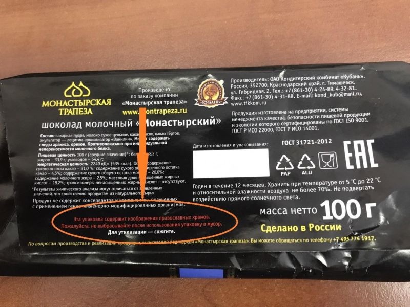 Російська компанія "Монастырская трапеза", яка виробляє "церковну продукцію для богослужінь високої якості за привабливою ціною", дуже трепетно ставиться до православної атрибутики. Так, обгортку шоколаду "Монастирський" настійно рекомендується не викидати в сміття, а спалити, оскільки на ній зображений храм.